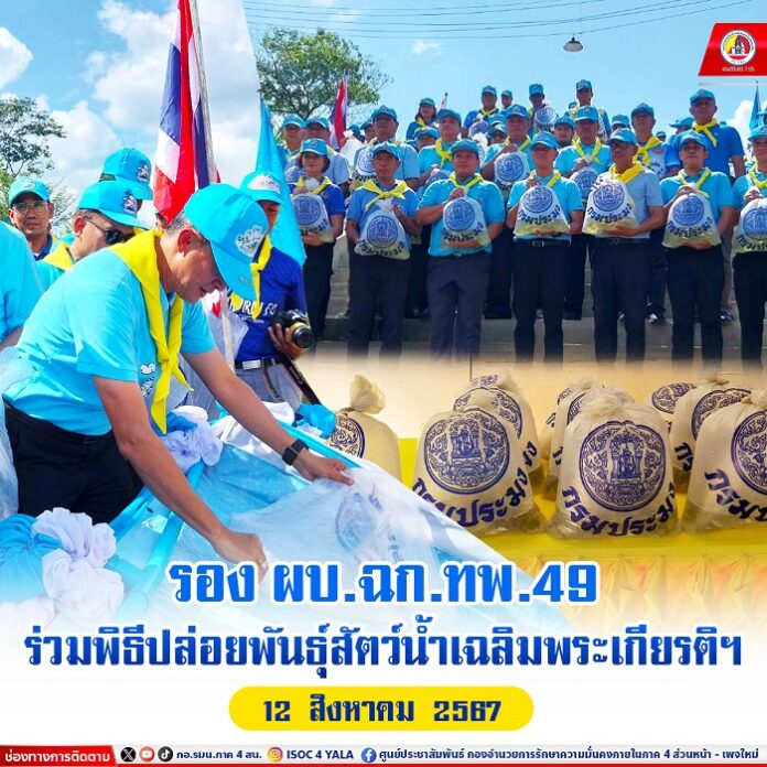 เมื่อวันที่ 9 สิงหาคม 2567 เวลา 14.00 น. พันเอก ภาณุวัฒน์ สุคชเดช ผู้บังคับหน่วยเฉพาะกิจกรมทหารพรานที่ 49 มอบหมายให้ พันโท อริย์ธัช นารี รองผู้บังคับหน่วยเฉพาะกิจกรมทหารพรานที่ 49 พร้อมด้วย จ่าสิบเอก บุรชัย หวันชิตนาย ผู้บังคับด่านตรวจเกียร์ร่วม 3 ฝ่าย และกำลังจิตอาสาของหน่วยฯ ร่วมกับส่วนราชการในพื้นที่อำเภอสุคิริน ร่วมพิธีปล่อยพันธุ์สัตว์น้ำ พันธุ์ปลาตะเพียน ปลายี่สกและปลาสุลต่าน จำนวน 2,000 ตัว และปลูกต้นตะเคียนทอง จำนวน 50 ต้น เนื่องในโอกาสเฉลิมพระชนมพรรษาสมเด็จพระนางเจ้าสิริกิติ์ พระบรมราชินีนาถพระบรมราชชนนีพันปีหลวง 12 สิงหาคม 2567 โดยมี ว่าที่ร้อยตรี ตระกูล โทธรรม ผู้ว่าราชการจังหวัดนราธิวาส เป็นประธานในพิธี ณ พระตำหนักสุคิริน ตำบลสุคิริน อำเภอสุคิริน จังหวัดนราธิวาส