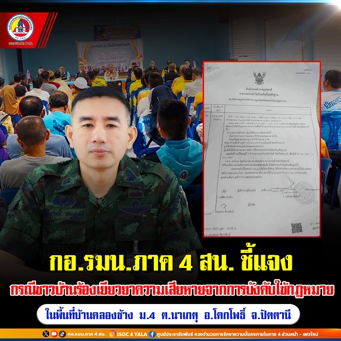 จากกรณีเจ้าหน้าที่เข้าบังคับใช้กฎหมายในพื้นที่บ้านคลองช้าง ตำบลนาเกตุ อำเภอโคกโพธิ์ จังหวัดปัตตานี ซึ่งเป็นเหตุให้เจ้าหน้าที่ เสียชีวิต 1 นาย บาดเจ็บ 2 นาย และผู้ก่อเหตุรุนแรง เสียชีวิต 3 ราย ในห้วงวันที่ 27 กรกฏาคม – 1 สิงหาคม 2567 ที่ผ่านมานั้น และได้ปรากฏข้อมูลผ่านสื่อโซเขียลออนไลน์ว่า มีชาวบ้านร้องเรื่องการช่วยเหลือเยียวยาความเสียหายจากการบังคับใช้กฎหมายดังกล่าว