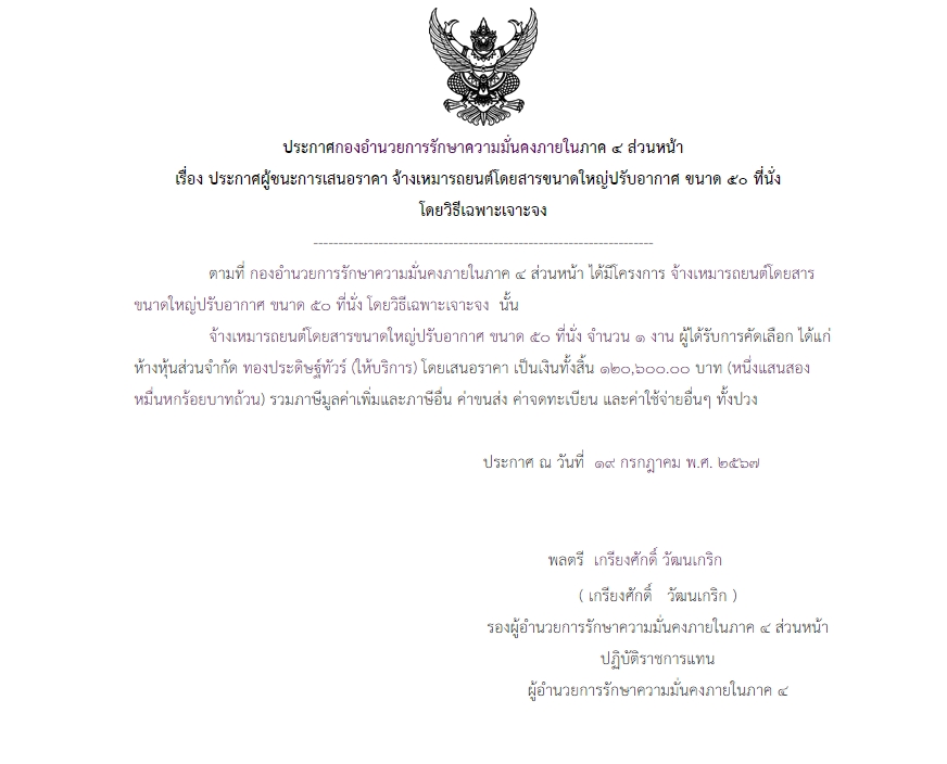จัดซื้อ จัดจ้างประกาศผู้ชนะการเสนอราคา ประกาศผู้ชนะการเสนอราคา จ้างเหมารถยนต์โดยสารขนาดใหญ่ปรับอากาศ ขนาด ๕๐ ที่นั่ง โดยวิธีเฉพาะเจาะจง August 13, 2024 271 Share Facebook Twitter Google+ Telegram LINE