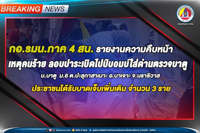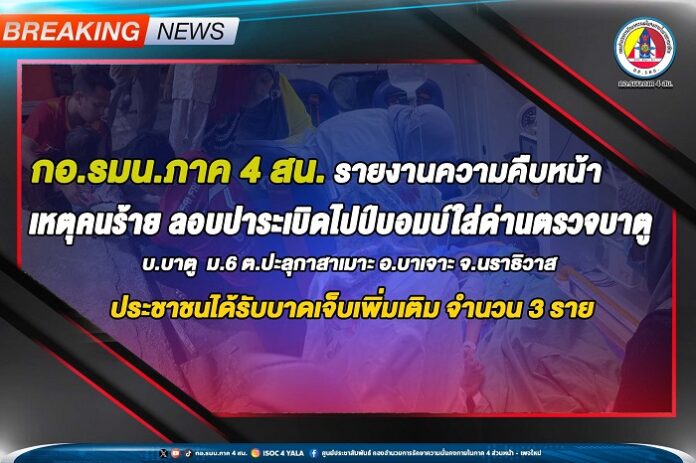 2 .เด็กชาย มูฮัมหมัดซูเบส ลาโม๊ะ อายุ 10 ปี มีบาดแผลบริเวณนิ้วชี้หลังเท้าซ้าย และมีอาการตกใจ ได้รับบาดเจ็บเล็กน้อย นำส่ง โรงพยาบาล บาเจาะ แพทย์ทำการรักษาและอนุญาตให้กลับไปพักฟื้นที่บ้านพัก