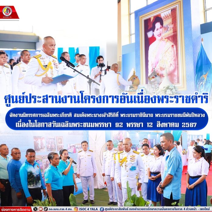 โอกาสนี้ ผู้บัญชาการกองพลทหารราบที่ 15 / ผู้อำนวยการศูนย์ประสานงานโครงการอันเนื่องมาจากพระราชดำริ ได้นำผู้ร่วมพิธีถวายความเคารพเบื้องหน้าพระฉายาลักษณ์ สมเด็จพระนางเจ้าสิริกิติ์ พระบรมราชินีนาถ พระบรมราชชนนีพันปีหลวง พร้อมเปิดกรวยกระทงดอกไม้ ต่อด้วยกล่าวถวายพระพรชัยมงคล, ลงนามถวายพระพร, รับชมการกล่าวสุนทรพจน์, การแสดงรำถวายพระพรและการขับร้องเพลงประสานเสียงในบทเพลง “สดุดีพระแม่ไทย” จากนักเรียนโรงเรียนนาทวีวิทยาคม และมอบรางวัลให้กับนักเรียนที่ได้รับรางวัลชนะเลิศ จากการประกวดวาดภาพในหัวข้อ “พระราชกรณียกิจ สมเด็จพระบรมราชชนนีพันปีหลวง ในดวงใจ” อีกทั้ง รับชมการขับร้องเพลงมาร์ช อรบ. จากตัวแทนสมาชิกกองพันราษฎรอาสารักษาหมู่บ้าน พร้อมร่วมรับชมวีดิทัศน์เทิดพระเกียรติ และเยี่ยมชมนิทรรศการพระราชกรณียกิจของสมเด็จพระนางเจ้าสิริกิติ์ พระบรมราชินีนาถ พระบรมราชชนนีพันปีหลวง รวมไปถึงซุ้มแสดงผลผลิตจากฟาร์มตัวอย่างฯ ในพื้นที่ 4 จังหวัด ได้แก่ จังหวัดนราธิวาส, จังหวัดยะลา จังหวัดปัตตานี และจังหวัดสงขลา