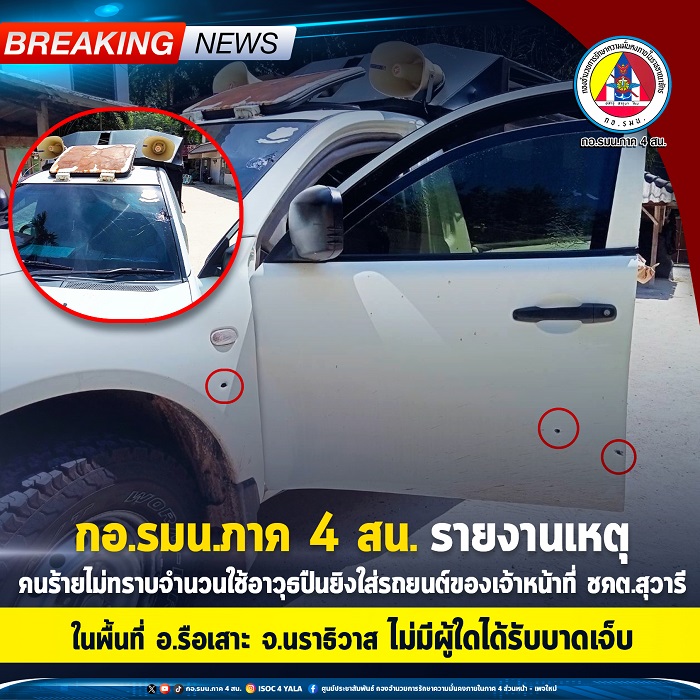 วันนี้ (13 สิงหาคม 2567) เวลาประมาณ 13.50 น. เกิดเหตุคนร้ายไม่ทราบจำนวนใช้อาวุธปืนไม่ทราบชนิดและขนาด ยิงใส่รถยนต์ของเจ้าหน้าที่ ชุดคุ้มครองตำบลสุวารี ขณะเดินทางกลับจากการรักษาความปลอดภัยให้กับคณะเหล่ากาชาดจังหวัดนราธิวาส เหตุเกิดบริเวณ ถนนทางหลวงหมายเลข 4066 รอยต่อระหว่าง บ้านยือลาแป หมู่ที่ 3 กับ บ้านปอเนาะ หมู่ที่ 6 ตำบลสุวารี อำเภอรือเสาะ จังหวัดนราธิวาส จากการตรวจสอบเบื้องต้นไม่มีผู้ใดได้รับบาดเจ็บ หรือเสียชีวิต
