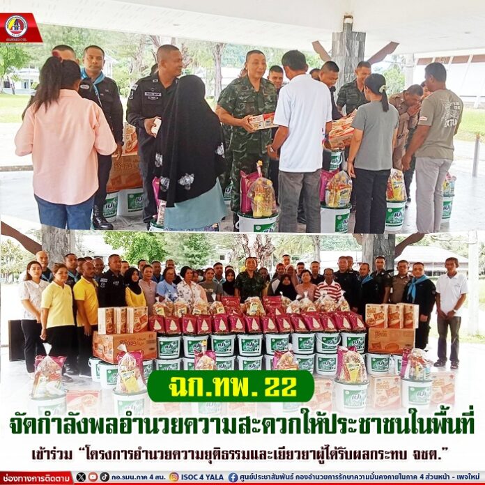 วันที่ 13 สิงหาคม 2567 หน่วยเฉพาะกิจกรมทหารพรานที่ 22 โดย กองร้อยทหารพรานที่ 2204 จัดกำลังพลชุดปฏิบัติการกิจการพลเรือน เข้าให้การสนับสนุนอำนวยความสะดวกในการ รับ ส่ง นางประคิน นุ้ยสุภาพ ที่อยู่ 143/1 บ้านม่วงหมัง หมู่ที่ 5 ตำบลเมาะมาวี อำเภอยะรัง จังหวัดปัตตานี เพื่อเข้ารับเครื่องอุปโภค/บริโภค ในโครงการอำนวยความยุติธรรมและเยียวยาผู้ได้รับผลกระทบจังหวัดชายแดนภาคใต้ ทั้งนี้เพื่อเป็นการแสดงออกถึงความห่วงใย และไม่ทอดทิ้งประชาชน รวมถึงเป็นการให้กำลังใจผู้ได้รับผลกระทบในพื้นที่จังหวัดชายแดนภาคใต้ โดยมี พลตรี ขจรศักดิ์ อินทร์ทอง ผู้บังคับหน่วยเฉพาะกิจปัตตานี เป็นประธานในการมอบเครื่องอุปโภค/บริโภคในครั้งนี้ ณ ศาลาเอนกประสงค์ ค่ายอิงคยุทธบริหาร ตำบลบ่อทอง อำเภอหนองจิก จังหวัดปัตตานี