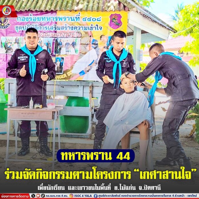 เมื่อวันที่ 14 สิงหาคม 2567 หน่วยเฉพาะกิจกรมทหารพรานที่ 44 จัดกำลังพลของหน่วยในส่วนของ “ชุดปฏิบัติการเสริมสร้างความเข้าใจ” เข้าพบปะพัฒนาสัมพันธ์ กับบุคลากรทางการศึกษา โรงเรียนบ้านสารวัน ตำบลไทรทอง อำเภอไม้แก่น จังหวัดปัตตานี รวมทั้งได้ให้การบริการตัดผมแก่นักเรียน ตามโครงการ “เกศาสานใจ” เพื่อพี่น้องประชาชน และเยาวชนในพื้นที่