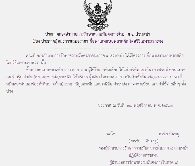 จัดซื้อ จัดจ้างประกาศผู้ชนะการเสนอราคา ประกาศผู้ชนะการเสนอราคา ซื้อพาเลทแบบพลาสติก โดยวิธีเฉพาะเจาะจง (42,250.00) December 14, 2020 779 Share Facebook Twitter Google+ Telegram LINE สกบ.กอ.รมน.ภาค ๔ สน.