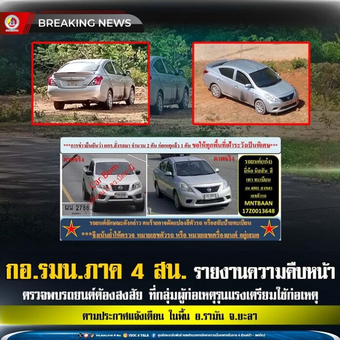 ล่าสุดวันนี้ (15 สิงหาคม 2567) เวลา 09.00 น. เจ้าหน้าที่หน่วยงานความมั่นคง ได้รับแจ้งจากประชาชนว่า พบรถยนต์ ยี่ห้อ นิสสัน รุ่น Almera สีเทา ไม่ติดแผ่นป้ายทะเบียน คล้ายรถยนต์ต้องสงสัยตามภาพข่าวที่แจ้งเตือนในห้วงที่ผ่านมา จอดอยู่ภายในป่าสวนยาง ตำบลบือมัง อำเภอรามัน จังหวัดยะลา ปัจจุบันเจ้าหน้าที่ได้ทำการควบคุมและปิดกั้นพื้นที่ อยู่ระหว่างชุดเก็บกู้และตรวจสอบวัตถุระเบิด และเจ้าหน้าที่พิสูจน์หลักฐาน เข้าพื้นที่ตรวจสอบรถยนต์ต้องสงสัยคันดังกล่าว เพื่อรวบรวมวัตถุพยาน หลักฐานต่างๆ ในพื้นที่ ตรวจสอบหาความเชื่อมโยงของกลุ่มคนร้ายมาดำเนินคดีตามกฎหมายโดยเร็วที่สุด สำหรับความคืบหน้าจะรายงานให้ทราบต่อไป