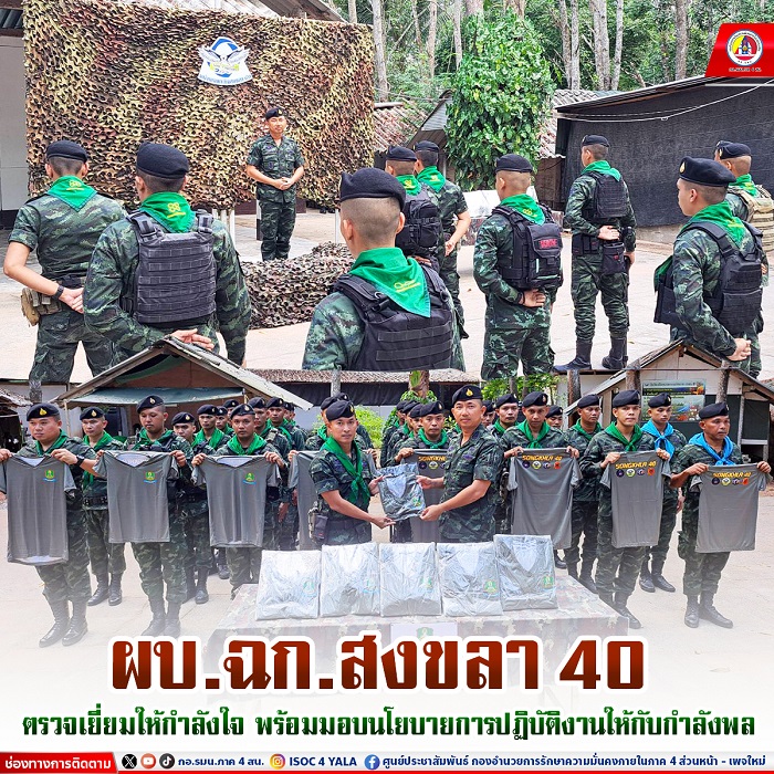 นอกจากนี้ ผู้บังคับหน่วยเฉพาะกิจสงขลา 40 ได้กล่าวขอบคุณกำลังพลที่ปฏิบัติหน้าที่ตามสั่งการของผู้บังคับบัญชาอย่างเคร่งครัด และภารกิจที่ได้รับมอบหมายสำเร็จลุล่วงไปด้วยดี สร้างความเชื่อมั่นในการดูแลรักษาความปลอดภัยของประชาชนทั้งชีวิตและทรัพย์สิน ในการนี้ ผู้บังคับหน่วยเฉพาะกิจสงขลา 40 ได้มอบเสื้อยืดรองใน เพื่อเป็นขวัญกำลังใจให้กับกำลังพลในการปฏิบัติหน้าที่ต่อไป