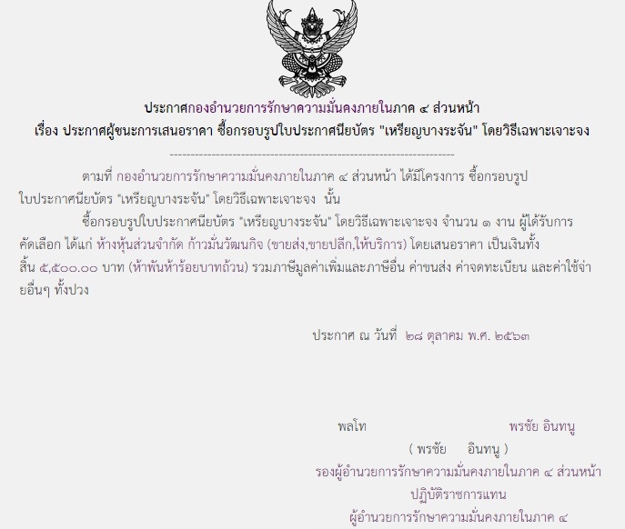 ประกาศผู้ชนะการเสนอราคา ซื้อกรอบรูปใบประกาศนียบัตร “เหรียญบางระจัน” โดยวิธีเฉพาะเจาะจง (5,500.00)