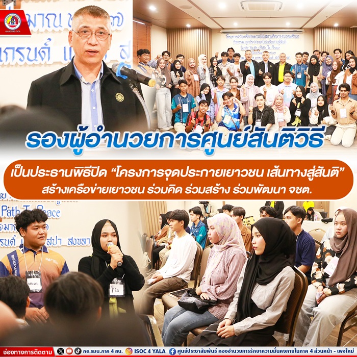 วันนี้ 18 สิงหาคม 2567 เวลา 11.30 น. ที่ โรงแรมลากูน่า แกรนด์ โฮเทล แอนด์ สปา อำเภอเมือง จังหวัดสงขลา พลตรี พงษ์ศักดิ์ อินทรเนตร รองผู้อำนวยการศูนย์สันติวิธี เป็นประธานพิธีปิดกิจกรรม “โครงการจุดประกายเยาวชน เส้นทางสู่สันติ Ignite Youth : Path to peace” เพื่อเสริมสร้างความเข้าใจกระบวนการคิด กระบวนการสร้างสังคมพหุวัฒนธรรมปฏิเสธความรุนแรงทุกรูปแบบ ให้ทุกคนอยู่ร่วมกันได้ในสังคมที่มีความแตกต่างหลากหลาย ทั้งด้านเชื้อชาติ ศาสนา ขนบธรรมเนียมประเพณีและวัฒนธรรม อีกทั้งยังส่งเสริมและสร้างทัศนคติที่ดีงามในสังคมต่อเยาวชน ซึ่งจัดขึ้นระหว่างวันที่ 17-18 สิงหาคม 2567 โดยมี พันเอก ปฐพี พุทธผล ผู้อำนวยการกองสันติวิธี ศูนย์สันติวิธี, เครือข่ายแกนนำ นักเรียน นักศึกษา และเยาวชนในสถาบันการศึกษา ทั้ง 39 คน เข้าร่วมในพิธี