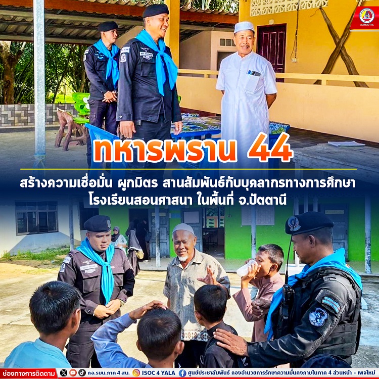 เมื่อวันที่ 18 สิงหาคม 2567 หน่วยเฉพาะกิจกรมทหารพรานที่ 44 จัดกำลังพลของหน่วยในส่วนของ ชุดปฏิบัติการเสริมสร้างความเข้าใจ (ชป.เสริมสร้างความเข้าใจ) เข้าพบปะพัฒนาสัมพันธ์ กับบุคลากรทางการศึกษา และเยาวชน (โรงเรียนสอนศาสนาตาดีกา) ในพื้นที่ เพื่อสร้างความเข้าใจ ลดความหวาดระแวง พร้อมทั้งสร้างความเชื่อมั่นเกี่ยวกับมาตรการต่างๆ ในการกำกับดูแลพื้นที่รับผิดชอบของหน่วย เพื่อความปลอดภัยของบุคลากรทางการศึกษาฯ และพี่น้องประชาชนในพื้นที่
