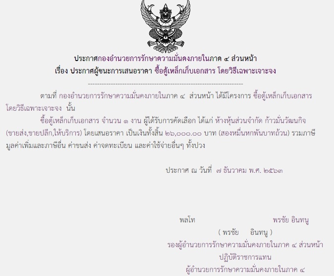 ประกาศผู้ชนะการเสนอราคา ซื้อตู้เหล็กเก็บเอกสาร โดยวิธีเฉพาะเจาะจง (26,000.00)