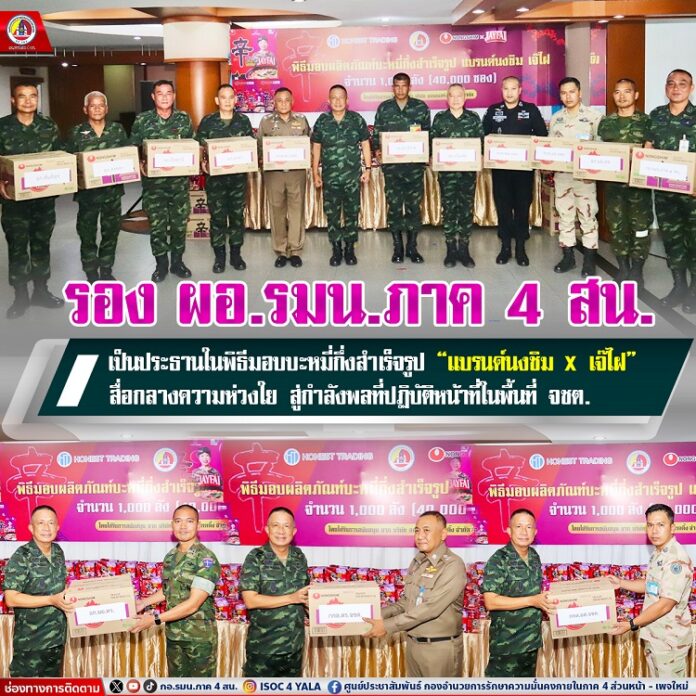 วันนี้ (19 สิงหาคม 2567) เวลา 10.00 น. ณ ห้องโถงอาคาร 1 กองอำนวยการรักษาความมั่นคงภายในภาค 4 ส่วนหน้า ค่ายสิรินธร ตำบลเขาตูม อำเภอยะรัง จังหวัดปัตตานี พลโท ปราโมทย์ พรหมอินทร์ แม่ทัพน้อยที่ 4 / รองผู้อำนวยการรักษาความมั่นคงภายในภาค 4 ส่วนหน้า เป็นประธานในพิธีมอบผลิตภัณฑ์บะหมี่กึ่งสำเร็จรูปรสต้มยำ แบรนด์นงชิม X เจ๊ไฝ เพื่อเป็นสื่อกลางความห่วงใย และเป็นขวัญกำลังใจให้กับกำลังพลที่ปฏิบัติงานในพื้นที่จังหวัดชายแดนภาคใต้ โดยมี ผู้บังคับบัญชา, ผู้แทนหน่วยเฉพาะกิจยะลา, ปัตตานี, นราธิวาส, และสงขลา, ผู้แทนกองกำลังตำรวจจังหวัดชายแดนภาคใต้, ผู้แทนหน่วยเฉพาะกิจนาวิกโยธินกองทัพเรือ, ผู้แทนหน่วยเฉพาะกิจสันติสุข, ผู้แทนกองกำลังทหารพรานจังหวัดชายแดนภาคใต้, ผู้แทนกองบังคับการควบคุมกองอาสารักษาดินแดนจังหวัดชายแดนภาคใต้ เข้าร่วมในพิธีอย่างพร้อมเพรียง