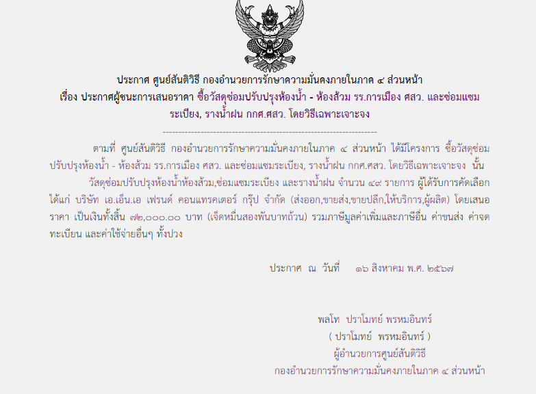 จัดซื้อ จัดจ้างประกาศผู้ชนะการเสนอราคา ประกาศผู้ชนะการเสนอราคา ซื้อวัสดุซ่อมปรับปรุงห้องน้ำ – ห้องส้วม รร.การเมือง ศสว. และซ่อมแชม ระเบียง, รางน้ำฝน กกศ.ศสว. โดยวิธีเฉพาะเจาะจง August 20, 2024 232 Share Facebook Twitter Google+ Telegram LINE ตารางแสดงวงเงินงบประมาณราคากลางงานปรับป
