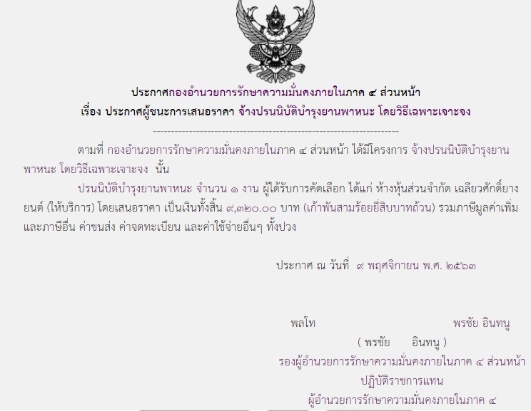 ประกาศผู้ชนะการเสนอราคา จ้างปรนนิบัติบำรุงยานพาหนะ โดยวิธีเฉพาะเจาะจง (9,320.00)