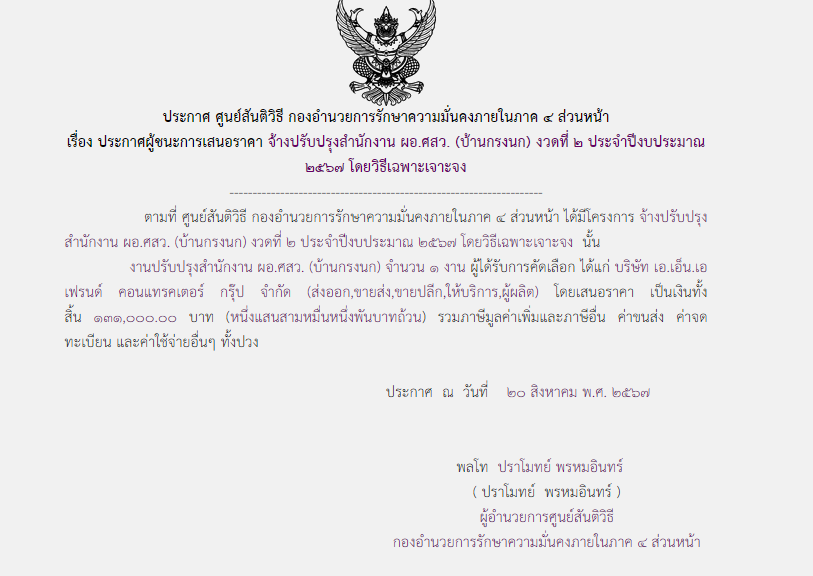 จัดซื้อ จัดจ้างประกาศผู้ชนะการเสนอราคา ประกาศผู้ชนะการเสนอราคา จ้างปรับปรุงสำนักงาน ผอ.ศสว. (บ้านกรงนก) งวดที่ ๒ ประจำปิ้งปรบประมาณ ๒๕๖๗ โดยวิธีเฉพาะเจาะจง August 21, 2024 409 Share Facebook Twitter Google+ Telegram LINE