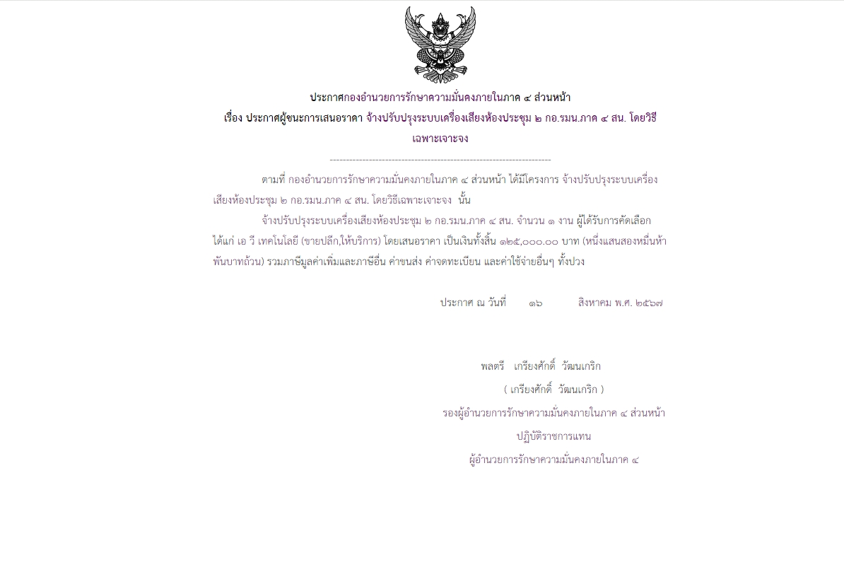 ประกาศผู้ชนะการเสนอราคา จ้างปรับปรุงระบบเครื่องเสียงห้องประชุม ๒ กอ.รมน.ภาค ๔ สน. โดยวิธี เฉพาะเจาะจง