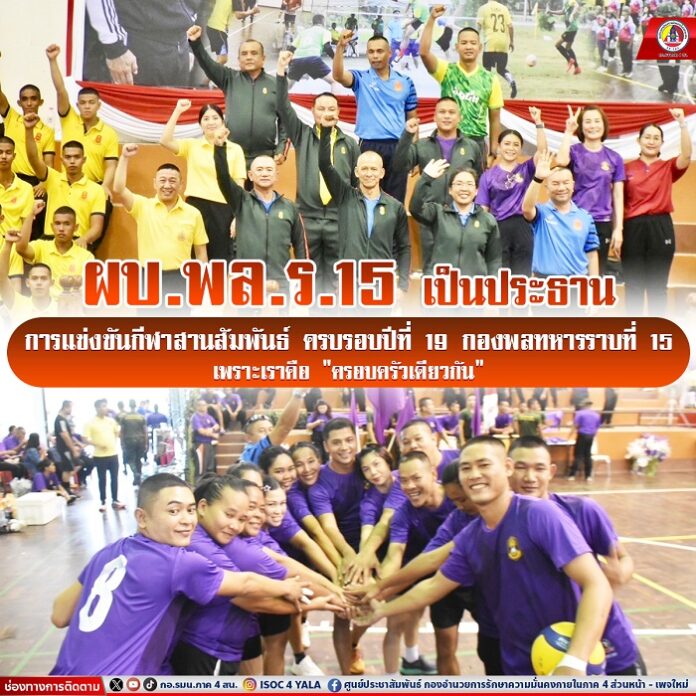 สำหรับการแข่งขันกีฬาสานสัมพันธ์ ครบรอบปีที่ 19 กองพลทหารราบที่ 15 ซึ่งจำแนกกลุ่มการแข่งขัน ออกเป็น 5 ประเภท ได้แก่ 1. กีฬาฟุตบอล 2.กีฬาแบตมินตัน 3. กีฬาตระกร้อ 4. กีฬาวอลเลย์บอล 5.กีฬาเพาะกาย และ 6.การแข่งขันกองเชียร์ โดยทีมที่ชนะเลิศจะได้รับเหรียญรางวัล พร้อมโล่รางวัล และของขวัญที่ระลึก บรรยากาศเป็นไปด้วยความอบอุ่น และความสนุกสนาน เป็นกิจกรรมที่สานสัมพันธ์ที่ดีให้แก่กำลังพล และครอบครัวในกองพลทหารราบที่ 15 “เพราะเราคือครอบครัวเดียวกัน”