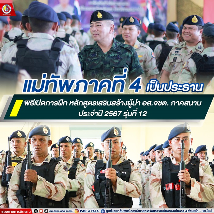 เมื่อวันที่ 22 สิงหาคม 2567 เวลา 13.30 น. ณ กองบังคับการควบคุมกองอาสารักษาดินแดนจังหวัดชายแดนภาคใต้ ศูนย์ฝึกอบรมกองกำลังประจำถิ่นท่าสาป อำเภอเมือง จังหวัดยะลา พลโท ศานติ ศกุนตนาค แม่ทัพภาคที่ 4 / ผู้อำนวยการรักษาความมั่นคงภายในภาค 4 เป็นประธานเปิดการฝึกเสริมสร้างขีดความสามารถสมาชิกกองอาสารักษาดินแดนจังหวัดชายแดนภาคใต้ (หลักสูตรผู้นำ อส.จชต.) ภาคสนาม ประจำปี 2567 รุ่นที่ 12 ระหว่างวันที่ 20 – 26 สิงหาคม 2567 โดยมี พลตรี นิติ ติณสูลานนท์ ผู้บังคับหน่วยเฉพาะกิจยะลา, พลตรี อภินันท์ แจ่มแจ้ง ผู้บังคับหน่วยเฉพาะกิจสงขลา, พันเอก อนุชา โนนคู่เขตโขง รองเลขาธิการกองอำนวยการรักษาความมั่นคงภายในภาค 4 ส่วนหน้า, รองผู้บังคับหน่วยเฉพาะกิจปัตตานี, รองผู้บังคับหน่วยเฉพาะกิจนราธิวาส, รองผู้บังคับหน่วยเฉพาะกิจนาวิกโยธินกองทัพเรือ, รองผู้บังคับหน่วยเฉพาะกิจสันติสุข, ผู้แทนกองอำนวยการรักษาความมั่นคงภายในจังหวัดยะลา, นายอำเภอ, ผู้อำนวยการส่วนปฏิบัติการจังหวัดชายแดนใต้, ป้องกันจังหวัดยะลา, ผู้แทนผู้บังคับหน่วยเฉพาะกิจตำรวจยะลา 91, ผู้แทนกองกำลังตำรวจจังหวัดชายแดนภาคใต้, หัวหน้าชุดคุ้มครองตำบล, ชุดครูฝึก, ตลอดจนผู้เข้ารับการฝึกให้การต้อนรับ