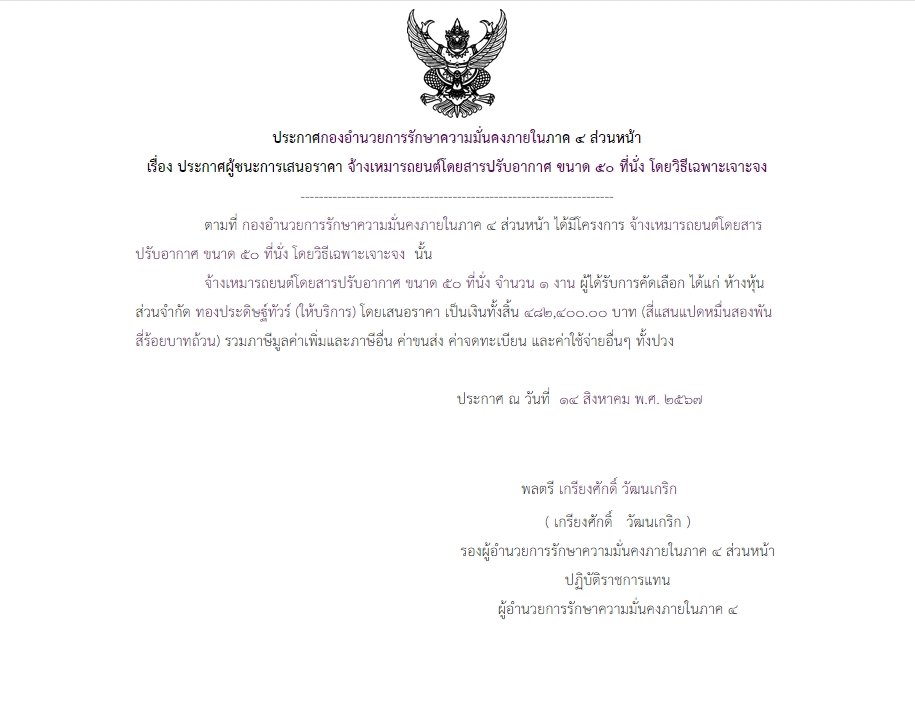 ประกาศผู้ชนะการเสนอราคา จ้างเหมารถยนต์โดยสารปรับอากาศ ขนาด ๕๐ ที่นั่ง โดยวิธีเฉพาะเจาะจง