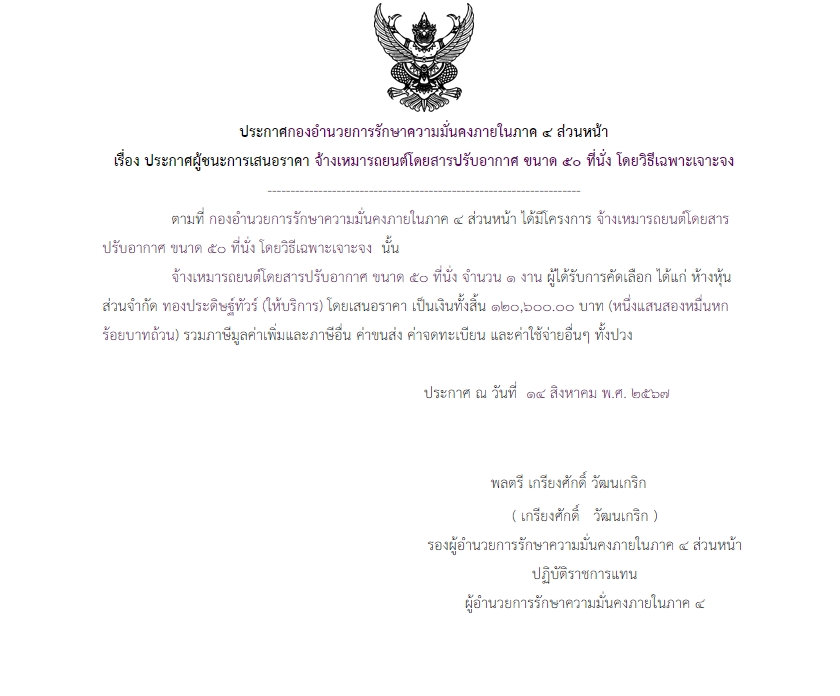 ประกาศผู้ชนะการเสนอราคา จ้างเหมารถยนต์โดยสารปรับอากาศ ขนาด ๕๐ ที่นั่ง โดยวิธีเฉพาะเจาะจง