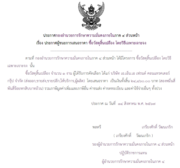 ประกาศผู้ชนะการเสนอราคา ซื้อวัสดุสิ้นเปลือง โดยวิธีเฉพาะเจาะจง