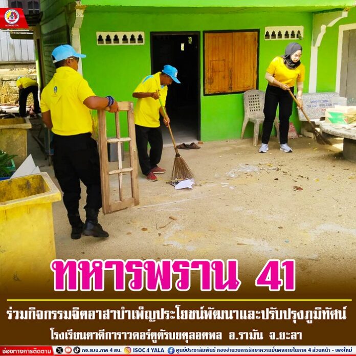 เมื่อวันที่ 22 สิงหาคม 2567 เวลา 09.00 น. หน่วยเฉพาะกิจกรมทหารพรานที่ 41 จัดกำลังพลจิตอาสา กองร้อยทหารพรานที่ 4115 ร่วมกับ ปลัดหญิง ตำบลอาซ่อง, ผู้นำชุมชน และประชาชนจิตอาสาในพื้นที่ ร่วมกิจกรรมจิตอาสา “เราทำความดี ด้วยหัวใจ” บำเพ็ญประโยชน์พัฒนาและปรับปรุงภูมิทัศน์ให้เกิดความสะอาด เป็นระเบียบเรียบร้อย และสร้างความประทับใจ อีกทั้งยังเป็นการสร้างความรัก ความสามัคคีในชุมชน ณ โรงเรียนตาดีการาวดอร์ตูตัรบยตุลอตพล หมู่ที่ 5 ตำบลอาซ่อง อำเภอรามัน จังหวัดยะลา