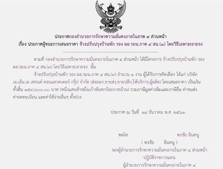 ประกาศผู้ชนะการเสนอราคา จ้างปรับปรุงบ้านพัก รอง ผอ.กอ.รมน.ภาค 4 สน. (3) โดยวิธีเฉพาะเจาะจง (159,600.00)
