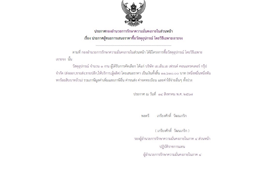 ประกาศผู้ชนะการเสนอราคา ซื้อวัสดุอุปกรณ์ โดยวิธีเฉพาะเจาะจง