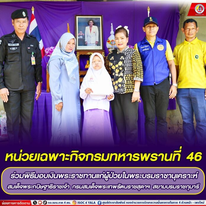 เมื่อวันที่ 27 สิงหาคม 2567 เวลา 10.00 น. พันเอก สิทธิชัย บำรุงเขต ผู้บังคับหน่วยเฉพาะกิจกรมทหารพรานที่ 46 มอบหมายให้ พันตรี สัมพันธ์ บัญชา รองเสนาธิการหน่วยเฉพาะกิจกรมทหารพรานที่ 46 พร้อมด้วย รองผู้บังคับกองร้อยทหารพรานที่ 4609 และ ชุดปฏิบัติการกิจการพลเรือนของหน่วย ร่วมกับ อำเภอรือเสาะ, กำนันตำบลโคกสะตอ, โรงพยาบาลรือเสาะ และโรงพยาบาลส่งเสริมสุขภาพตำบลโคกสะตอ ลงพื้นที่พบปะเยี่ยมเยียนให้กำลังใจ ครอบครัว ด.ญ.นูรอาซีกีน เจ๊ะกาเดร์ ซึ่งป่วยเป็นโรคผนังกั้นหัวใจรั่ว และเป็นผู้ป่วยในพระบรมราชานุเคราะห์ สมเด็จพระกนิษฐาธิราชเจ้า กรมสมเด็จพระเทพรัตนราชสุดาฯ สยามบรมราชกุมารี ณ บ้านเลขที่ 106 บ้านไอร์จือนะ หมู่ที่ 5 ตำบลโคกสะตอ อำเภอรือเสาะ จังหวัดนราธิวาส โดยมี นายหฤษฎ์ มาหะมะ ปลัดอาวุโสอำเภอรือเสาะ เป็นประธาน