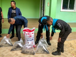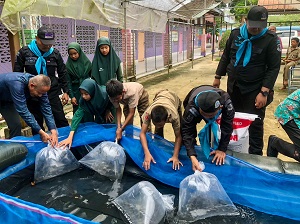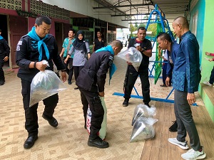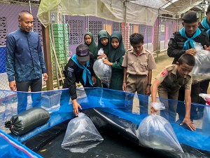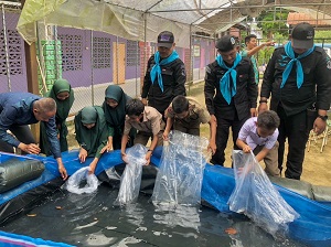 เมื่อวันที่ 29 สิงหาคม 2567 ที่ แปลงเกษตรฯ โรงเรียนบ้านป่าม่วง หมู่ที่ 2 บ้านกาแระ ตำบลมะนังดาลำ อำเภอสายบุรี จังหวัดปัตตานี หน่วยเฉพาะกิจกรมทหารพรานที่ 44 จัดกำลังพล ร่วมกับ บุคลากรทางการศึกษา ร่วมปล่อยพันธุ์สัตว์น้ำ (ปลาขนาดเล็ก) ซึ่งได้รับการสนับสนุนจากกรมประมงอำเภอสายบุรี เพื่อนำไปต่อยอดเกี่ยวกับการดำเนินงานในด้านเกษตรชุมชนแบบฟื้นฟู ภายใต้ “โครงการอาหารชุมชนโรงเรียนต้นแบบ” (แบบขยายผล) โดยใช้แนวคิดตามหลักปรัชญาเศรษฐกิจพอเพียง โดยได้นำมาปล่อยในบ่อที่จัดเตรียม เพื่อขยายพันธุ์ตามโครงการอาหารชุมชนโรงเรียนต้นแบบ เพื่อส่งเสริมการปลูกผักปลอดภัย และการเลี้ยงสัตว์ เพื่อผลิตอาหารที่มีคุณภาพและปลอดภัย ในการนำไปใช้การประกอบเป็นอาหารกลางวันภายในโรงเรียน อันจะทำให้นักเรียนได้บริโภคอาหารที่ปลอดภัยมีคุณค่าทางโภชนาการ ซึ่งจะทำให้นักเรียนมีคุณภาพชีวิตที่ดีขึ้น อีกทั้งยังเป็นแหล่งเรียนรู้ให้กับชุมชนที่อยู่รอบโรงเรียนมาศึกษานำไปปฏิบัติในชุมชนได้ต่อไป