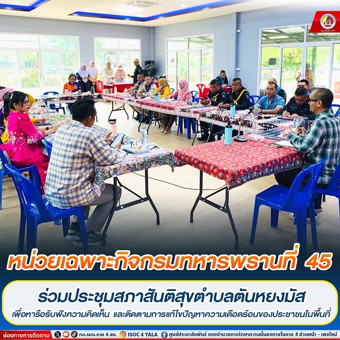 เมื่อวันที่ 29 สิงหาคม 2567 เวลา 10.00 น. ที่ห้องประชุมองค์การบริหารตำบลตันหยงมัส อำเภอระแงะ จังหวัดนราธิวาส ชุดปฏิบัติการกิจการพลเรือน หน่วยเฉพาะกิจกรมทหารพรานที่ 45 ร่วมประชุมสภาสันติสุข ตำบลตันหยงมัส ประจำเดือน สิงหาคม 2567 ประชุมคณะกรรมการฯ เพื่อหารือรับฟังความคิดเห็นและติดตามการแก้ไขปัญหาความเดือดร้อนของประชาชนในพื้นที่ เสริมสร้างทัศนคติที่ดี ลดเงื่อนไข เกิดความหลากหลายทางวัฒนธรรมในพื้นที่ และขับเคลื่อนสภาสันติสุขให้เกิดเป็นรูปธรรมต่อไป โดยมี ส่วนราชการ ,ปลัดประจำตำบล ,คณะกรรมการสภาฯ ,ผู้นำศาสนา ,ผู้นำท้องถิ่น , ผู้นำท้องที่ , บัณฑิตอาสา และบุคลากรทางการศึกษาในพื้นที่ร่วมประชุมอย่างพร้อมเพรียง