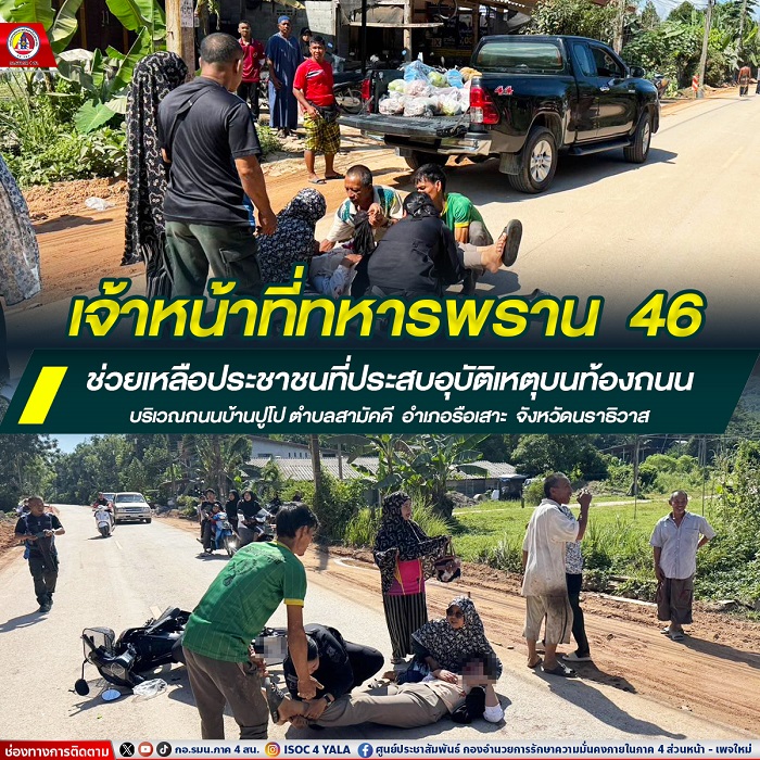 วันที่ 30 สิงหาคม 2567 เวลา 09.30 น. สิบเอกหญิง สุชาฎา ด้วงสวัสดิ์ ผู้บังคับหมู่ทหารพรานหญิงที่ 436 หมวดทหารพรานหญิงที่ 43 พร้อมด้วย อาสาสมัครทหารพราน พรหมราช วิเศษชาติ เจ้าหน้าที่ทหารพรานหน่วยเฉพาะกิจกรมทหารพรานที่ 46 พบเห็นชาวบ้านประสบอุบัติเหตุขณะเดินทางไปติดต่อราชการ โดยเหตุการณ์ประชาชนประสบอุบัติเหตุรถจักรยานยนต์เฉี่ยวชนกัน บริเวณถนนบ้านปูโป หมู่ที่ 1 ตำบลสามัคคี อำเภอรือเสาะ จังหวัดนราธิวาส จึงเข้าให้การช่วยเหลือทันที จากการเข้าให้การช่วยเหลือพบผู้ได้รับบาดเจ็บจำนวน 4 คน เป็นเพศหญิง 1 คน เพศชาย 3 คน จึงได้ช่วยทำการปฐมพยาบาลเบื้องต้น พร้อมกับประสานหน่วยกู้ภัยเพื่อเข้าช่วยเหลือ นำผู้บาดเจ็บส่งโรงพยาบาลต่อไป