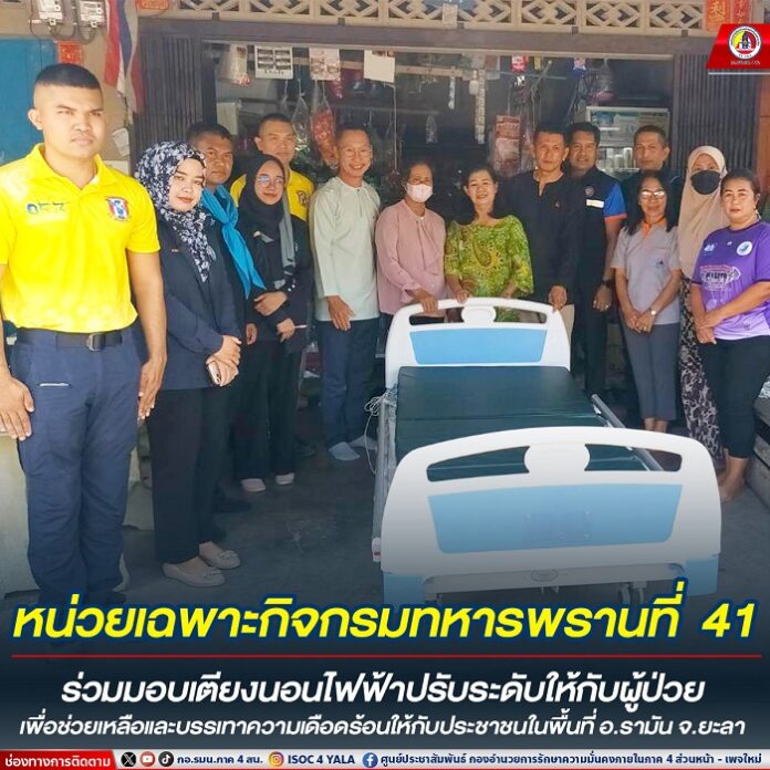 วันที่ 30 สิงหาคม 2567 เวลา 08.30 น. ที่บ้านเลขที่ 20/1 ถนนเสนารัตน์ ตำบลกายูบอเกาะ อำเภอรามัน จังหวัดยะลา หน่วยเฉพาะกิจกรมทหารพรานที่ 41 จัดกำลังพลชุดปฏิบัติการกิจการพลเรือน กองร้อยทหารพรานที่ 4104 ร่วมกับ นายกเทศมนตรี เทศบาลตำบลเมืองรามันห์, อาสาสมัครสาธารณสุขประจำหมู่บ้าน (อสม.) และชุดควบคุมที่ 953 ลงพื้นที่พบปะเยี่ยมเยียน นางปราณี ศรีมหันโต อายุ 94 ปี ซึ่งเป็นประชาชนกลุ่มเปราะบางในพื้นที่ และเป็นผู้ป่วยติดเตียง พร้อมทั้งร่วมมอบเตียงนอนไฟฟ้าปรับระดับให้กับผู้ป่วย เพื่อเป็นการช่วยเหลือ และบรรเทาความเดือดร้อนในชีวิตประจำวัน สร้างขวัญกำลังใจที่ดีให้กับครอบครัว “เพราะทหารจะดูแลช่วยเหลือประชาชนในทุกโอกาส”