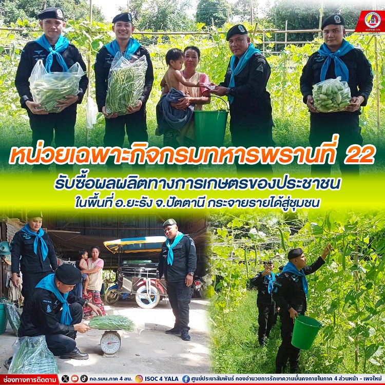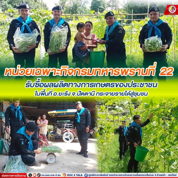 เมื่อวันที่ 31 สิงหาคม 2567 กองร้อยทหารพรานที่ 2206 หน่วยเฉพาะกิจกรมทหารพรานที่ 22 จัดกำลังพลชุดปฏิบัติการพลเรือน เข้าพบปะพัฒนาสัมพันธ์กับเกษตรกรในพื้นที่ ตำบลเขาตูม อำเภอยะรัง จังหวัดปัตตานี พร้อมทั้งอุดหนุนผลผลิตทางการเกษตรของประชาชนในพื้นที่ เพื่อกระจายรายได้สู่ชุมชน อีกทั้งยังได้สานสัมพันธ์ที่ดีระหว่างเจ้าหน้าที่กับประชาชน และเป็นการช่วยบรรเทาความเดือดร้อนของเกษตรกรจากสถานการณ์ผลผลิตทางการเกษตรล้นตลาด และมีราคาตกต่ำในปัจจุบัน ทั้งนี้ยังสร้างขวัญ กำลังใจ เพราะทหารจะเป็นที่พึ่งให้ประชาชนในทุกโอกาส