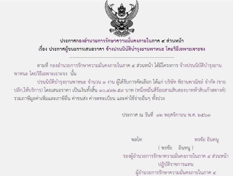จัดซื้อ จัดจ้างประกาศผู้ชนะการเสนอราคา ประกาศผู้ชนะการเสนอราคา จ้างปรนนิบัติบำรุงยานพาหนะ โดยวิธีเฉพาะเจาะจง (10,432.59) December 16, 2020 925 Share Facebook Twitter Google+ Telegram LINE สกบ.กอ.รมน.ภาค ๔ สน