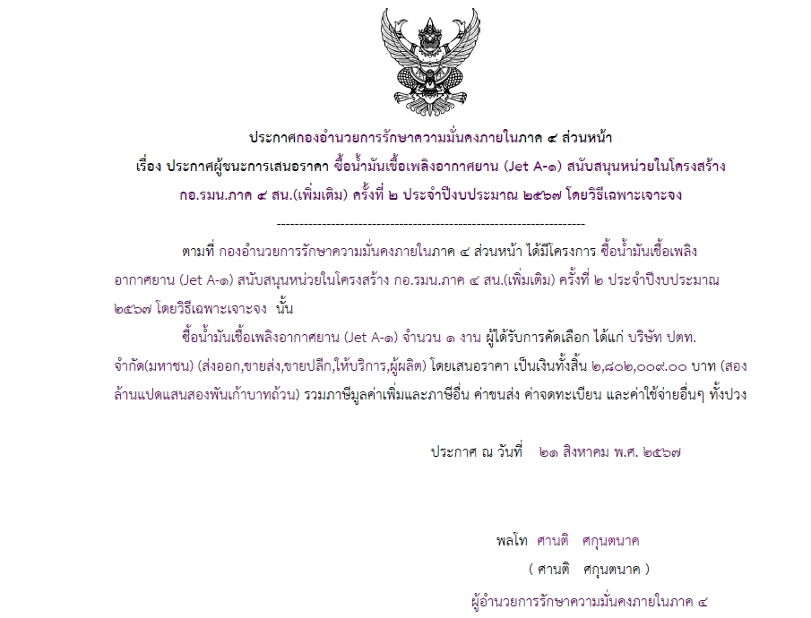 จัดซื้อ จัดจ้างประกาศผู้ชนะการเสนอราคา ประกาศผู้ชนะการเสนอราคา ซื้อน้ำมันเชื้อเพลิงอากาศยาน (Jet A-๑) สนับสนุนหน่วยในโครงสร้าง กอ.รมน.ภาค ๔ สน.(เพิ่มเติม) ครั้งที่ ๒ ประจำปีงบประมาณ ๒๕๖๗ โดยวิธีเฉพาะเจาะจง September 3, 2024 287 Share Facebook Twitter Google+ Telegram LINE