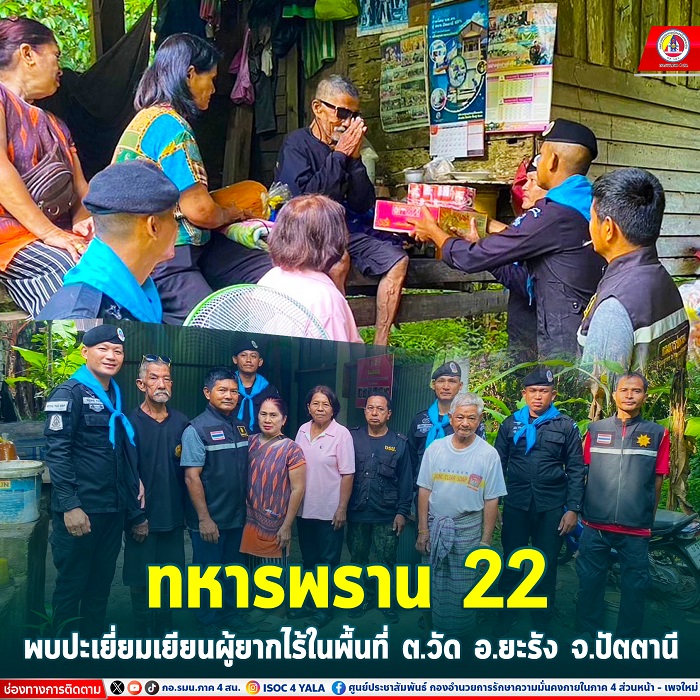 วันที่ 4 กันยายน 2567 กองร้อยทหารพรานที่ 2205 หน่วยเฉพาะกิจกรมทหารพรานที่ 22 จัดกำลังพลชุดปฏิบัติการกิจการพลเรือน ร่วมกับ ผู้นำชุมชน ลงพื้นที่พบปะเยี่ยมเยียนให้กำลังใจ พร้อมมอบสิ่งของอุปโภคบริโภค ให้กับครอบครัวนาย ทิม สำเภาปลอด ซึ่งเป็นผู้ยากไร้ในพื้นที่ เพื่อเป็นการให้ความช่วยเหลือ และบรรเทาความเดือนร้อนให้กับประชาชนในพื้นที่ และยังเป็นการเสริมสร้างความสัมพันธ์ที่ดีต่อกัน ณ บ้านเลขที่ 13/3 หมู่ที่ 3 บ้านเกาะหวาย ตำบลวัด อำเภอยะรัง จังหวัดปัตตานี