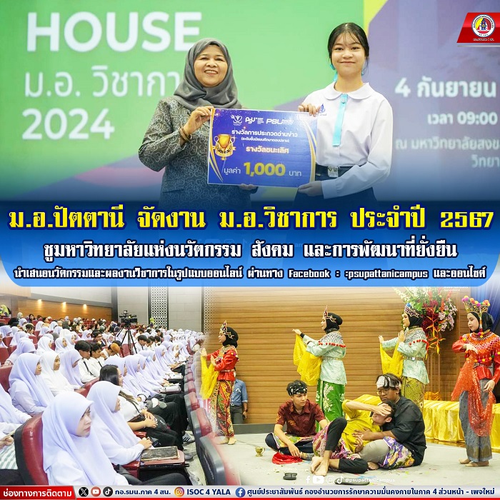 วันที่ 4 กันยายน 2567 ที่มหาวิทยาสงขลานครินทร์ วิทยาเขตปัตตานี ตำบลรูสะมิแล อำเภอเมือง จังหวัดปัตตานี นางพาตีเมาะ สะดียามู ผู้ว่าราชการจังหวัดปัตตานี เป็นประธานในพิธีเปิดงาน ม.อ.ปัตตานี จัดงาน ม.อ.วิชาการ ประจำปี 2567 โดยมี ผศ.ดร.อรุณีวรรณ บัวเนี่ยว รองอธิการบดีฝ่ายวิจัยและพันธกิจสังคม วิทยาเขตปัตตานี กล่าวรายงาน กิจกรรมประกอบด้วย การแสดงผลงานวิจัยและนวัตกรรม ,การเสวนาด้านวิชาการ ,การบรรยายแลกเปลี่ยนเรียนรู้ ,การจัดแสดงนิทรรศการ ,การแข่งขันและการประกวดทักษะด้านวิชาการ และสิ่งประดิษฐ์ ,การจัดแสดงนิทรรศการและผลิตภัณฑ์ชุมชน