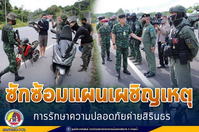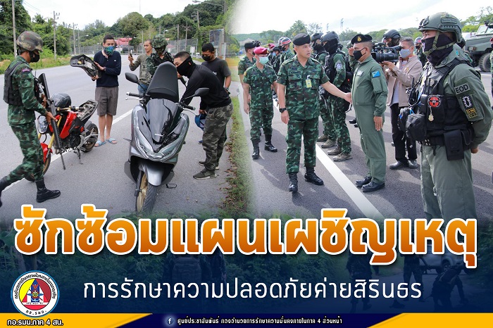กองอำนวยการรักษาความมั่นคงภายในภาค 4 ส่วนหน้า พร้อมหน่วยกำลังภายในค่ายสิรินธร และหน่วยข้างเคียง 14 หน่วย ร่วมซักซ้อมแผนเผชิญเหตุการรักษาความปลอดภัยค่ายสิรินธร เพื่อเตรียมความพร้อมรองรับสถานการณ์ความไม่สงบ คุ้มครองความปลอดภัยของกำลังพลและครอบครัวภายในค่ายสิรินธร ตลอดจนเพื่อให้กำลังพลเกิดความพร้อมและความชำนาญแก่หน่วยงานที่เกี่ยวข้อง รวมถึงแนวทางการกู้ชีพ/กู้ภัย ในการเข้าช่วยเหลือผู้ประสบเหตุได้อย่างปลอดภัย โดยมี พันเอก นิติ ติณสูลานนท์ รองเลขาธิการกองอำนวยการรักษาความมั่นคงภายในภาค 4 ส่วนหน้า เป็นประธานในการซักซ้อม