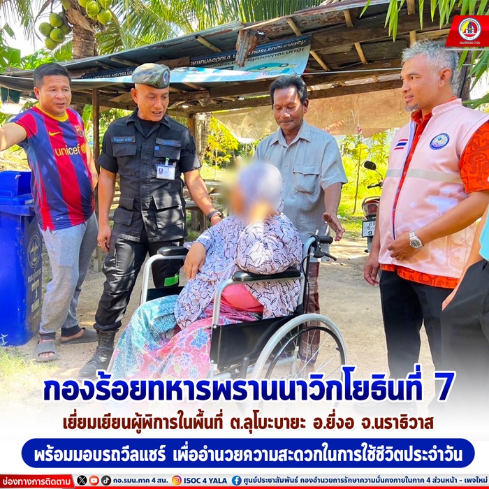 เมื่อวันที่ 5 กันยายน 2567 เวลา 10.00 น. กองร้อยทหารพรานนาวิกโยธินที่ 7 หน่วยเฉพาะกิจนาวิกโยธินกองทัพเรือ/หน่วยเฉพาะกิจนาวิกโยธินกองทัพเรือภาคใต้ ร่วมกับ โรงพยาบาลส่งเสริมสุขภาพตำบลลุโบะบายะ, ผู้นำท้องที่ ,เจ้าหน้าที่ อาสาสมัครสาธารณสุขประจำหมู่บ้าน (อสม.) ลงพื้นที่ไปยังบ้านเลขที่ 34 บ้านลุโบะบายะ หมู่ที่ 1 ตำบลลุโบะบายะ อำเภอยี่งอ จังหวัดนราธิวาส เพื่อเยี่ยมเยียน นางสาวฮัสเมาะ สุหลง ซึ่งเป็นผู้พิการในพื้นที่ พร้อมทั้งได้มอบรถวีลแชร์ เพื่ออำนวยความสะดวกในการใช้ชีวิตประจำวัน และยังสร้างขวัญกำลังใจที่ดีให้กับผู้พิการและครอบครัว ตลอดจนยังลดความหวาดระแวงต่อเจ้าหน้าที่ “เพราะทหารคือที่พึ่งของประชาชนในทุกโอกาส”