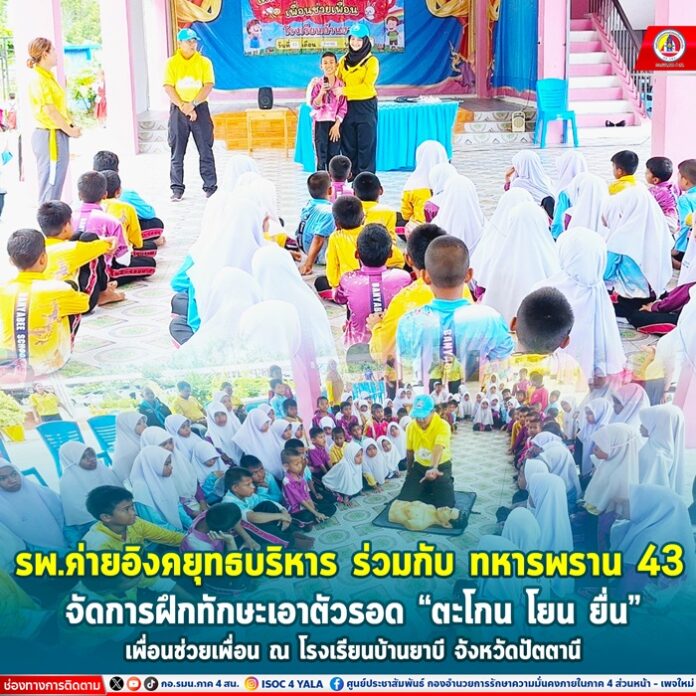 โรงพยาบาลค่ายอิงคยุทธบริหาร ร่วมกับชุดปฏิบัติการกิจการพลเรือน กองร้อยทหารพราน 4316 จัดกิจกรรม ตามโครงการ “ร้องตะโกน โยน ยื่น” เพื่อนช่วยเพื่อน” ณ โรงเรียนบ้านยาบี ตำบลยาบี อำเภอหนองจิก จังหวัดปัตตานี โดยใช้กิจกรรมการปฐมพยาบาลเบื้องต้น การช่วยชีวิตขั้นพื้นฐาน เพื่อให้นักเรียนมีทักษะช่วยชีวิตให้เพื่อนนักเรียนปลอดภัยจากการจมน้ำและการช่วยเหลือภาวะทางเดินหายใจถูกอุดกั้น (Choking) โดยมี นาย ชวนชิด รักเถาว์ ผู้อำนวยการโรงเรียน และคณะครู ให้การต้อนรับ