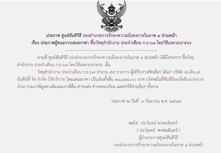 ประกาศผู้ชนะการเสนอราคา ซื้อวัสดุสำนักงาน ประจำเดือน ก.ย.๖๗ โดยวิธีเฉพาะเจาะจง