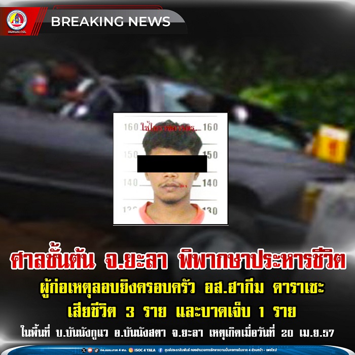จากกรณีเหตุการณ์เมื่อวันที่ 20 เมษายน 2557 โดยคนร้ายได้ลอบยิงสมาชิกในครอบครัวของ อาสาสมัคร ฮากีม ดาราเซะ อดีต สมาชิกกองอาสารักษาดินแดนอำเภอ บันนังสตา จังหวัดยะลา เสียชีวิต 3 ราย และได้บาดเจ็บ 1 ราย เหตุเกิดบนนถนนสาย 410 ในพื้นที่ หมู่ที่ 4 บ้านบันนังกูแว อำเภอบันนังสตา จังหวัดยะลา โดยภายหลังเกิดเหตุ เจ้าหน้าที่ได้ควบคุมพื้นที่และปิดกั้นที่เกิดเหตุ ตรวจสอบหาวัตถุพยานและรวบรวมหลักฐานต่าง ๆ จากนั้นเจ้าหน้าที่ได้ดำเนินการติดตามและขยายผลจนกระทั่งนำไปสู่การจับกุมตัวคนร้ายมาดำเนินคดีตามกฎหมายได้ในที่สุด