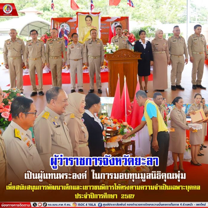 วันนี้ 10 กันยายน 2567 เวลา 10.00 น. ณ อาคารดลเดช – นฤมล พัฒนรัฐ ศูนย์การศึกษาพิเศษเขตการศึกษา 2 จังหวัดยะลา ตำบลบุดี อำเภอเมืองยะลา จังหวัดยะลา นายอำพล พงศ์สุวรรณ ผู้ว่าราชการจังหวัดยะลา เป็นผู้แทนพระองค์ ในการมอบทุนการศึกษาให้กับผู้พิการในจังหวัดยะลา ซึ่งทุนการศึกษาที่ได้รับในครั้งนี้ เพื่อให้เป็นไปตามวัตถุประสงค์ของทางมูลนิธิ โดยนำทุนการศึกษาไปใช้ให้เกิดประโยชน์สูงสุดกับบุตรหลานที่มีความต้องการพิเศษ เพื่อให้เด็กกลุ่มนี้ได้รับการพัฒนาศักยภาพผู้เรียน ในด้านการศึกษาและการพัฒนาศักยภาพอื่นตามความต้องการจำเป็นพิเศษของแต่ละบุคคลต่อไป โดยมี นางฉลวย พงค์สุวรรณ นายกเหล่ากาชาดจังหวัดยะลา หัวหน้าส่วนราชการต่าง ๆ คณะครู ผู้ปกครองและนักเรียน เข้าร่วมพิธีโดยพร้อมเพรียงกัน