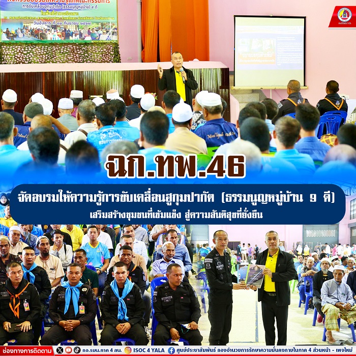 วันที่ 10 กันยายน 2567 เวลา 09.30 น. ณ ศาลาอุปการประชากร สวนกาญจนาภิเษก ตำบลรือเสาะ อำเภอรือเสาะ จังหวัดนราธิวาส พันเอก นพดล พรหมมาก รองผู้บังคับหน่วยเฉพาะกิจกรมทหารพรานที่ 46 ให้การต้อนรับ พันเอก ปฐพี พุทธผล ผู้อำนวยการกองสันติวิธี ศูนย์สันติวิธี (ผอ.กสธ.ศสว.) ซึ่งให้เกียรติมาเป็นวิทยากรบรรยายพิเศษ ในหัวข้อ “การขับเคลื่อนธรรมนูญหมู่บ้าน 9 ดี (ฮูกุมปากัต) และการสร้างความเข้าใจแนวทางการปลูกฝังยะกีน” ให้กับส่วนราชการ, ชุดปฏิบัติการกิจการพลเรือนของหน่วย, ประธานคณะกรรมการหมู่บ้าน, กรรมการหมู่บ้าน และผู้นำศาสนาในพื้นที่ อำเภอรือเสาะ จังหวัดนราธิวาส