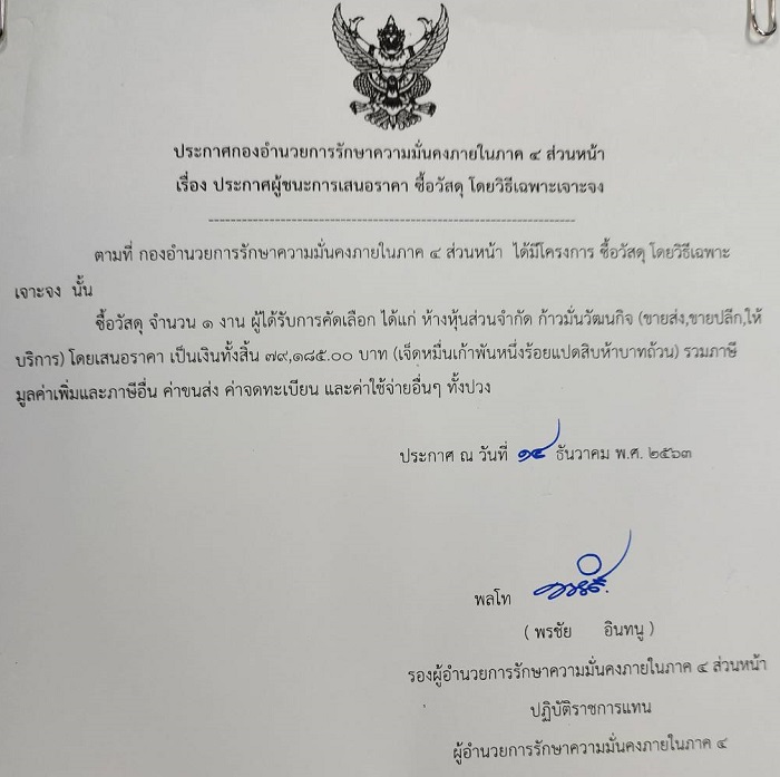 ประกาศผู้ชนะการเสนอราคา ซื้อวัสดุ โดยวิธีเฉพาะเจาะจง (79,185.00)