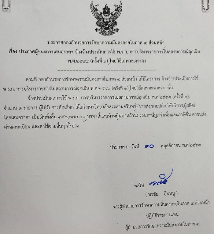 จัดซื้อ จัดจ้างประกาศผู้ชนะการเสนอราคา ประกาศผู้ชนะการเสนอราคา จ้างจ้างประเมินการใช้ พ.ร.ก. การบริหารราชการในสถานการณ์ฉุกเฉิน พ.ศ.2548 (ครั้งที่ 1 ) โดยวิธีเฉพาะเจาะจง (450,000.00) December 16, 2020 1110 Share Facebook Twitter Google+ Telegram LINE สกบ.กอ.รมน.ภาค ๔ สน