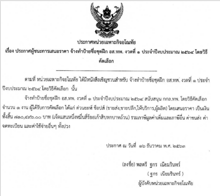 จัดซื้อ จัดจ้างประกาศผู้ชนะการเสนอราคา ประกาศผู้ชนะการเสนอราคา จ้างทำป้ายซื่อชุดฝึก อส.ทพ. งวดที่ 1 ประจำปีงบประมาณ 2564 โดยวิธีคัดเลือก (710,496.00) December 17, 2020 1075 Share Facebook Twitter Google+ Telegram LINE ฉก.อโณทัย