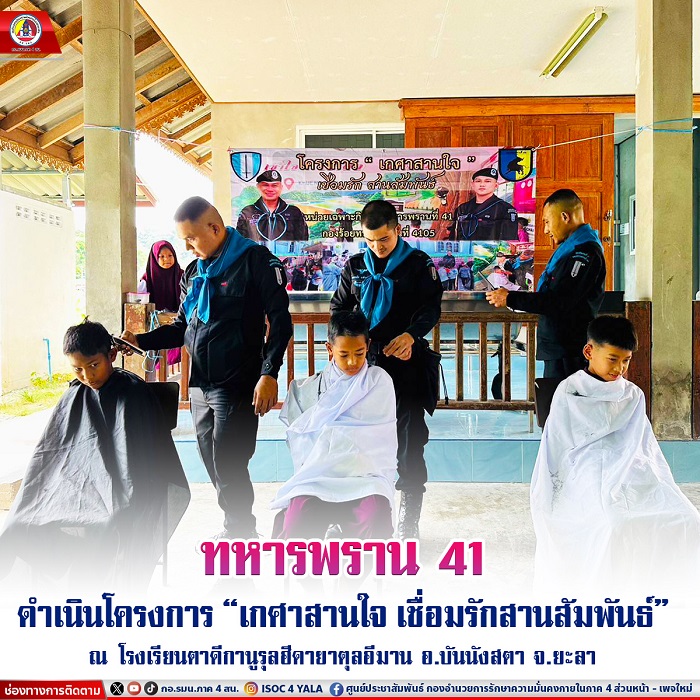 วันที่ 15 กันยายน 2567 เวลา 09.30 น. หน่วยเฉพาะกิจกรมทหารพรานที่ 41 จัดกำลังพลชุดปฏิบัติการกิจการพลเรือน กองร้อยทหารพรานที่ 4105 ลงพื้นที่ให้บริการตัดผมกับนักเรียน ตามโครงการ “เกศาสานใจ เชื่อมรักสานสัมพันธ์” ณ โรงเรียนตาดีกานูรุลฮีดายาตุลอีมาน หมู่ที่ 5 บ้านคอลอกาเอ ตำบลบาเจาะ อำเภอบันนังสตา จังหวัดยะลา