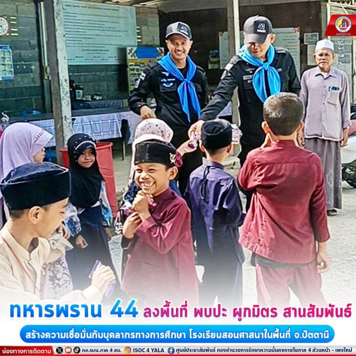 วันที่ 15 กันยายน 2567 หน่วยเฉพาะกิจกรมทหารพรานที่ 44 จัดกำลังพล ชุดปฏิบัติการเสริมสร้าง ความเข้าใจ ลงพื้นที่ ณ สถานศึกษาประจำมัสยิด (โรงเรียนสอนศาสนาตาดีกา) ในพื้นที่รับผิดชอบของหน่วยทั้ง 4 อำเภอ ประกอบด้วย อำเภอสายบุรี, อำเภอกะพ้อ, อำเภอทุ่งยางแดง และอำเภอไม้แก่น จังหวัดปัตตานี เพื่อเข้าพบปะพัฒนาสัมพันธ์ กับบุคลากรทางการศึกษา และเด็กนักเรียน เพื่อสร้างความเข้าใจ ได้แจ้งข้อมูลข่าวสารต่าง ๆ เกี่ยวกับสถานการณ์ในปัจจุบันให้กับบุคลากรทางการศึกษาฯ ได้รับทราบ พร้อมทั้งสร้างความเชื่อมั่นเกี่ยวกับมาตรการต่างๆ ในการดูแลพื้นที่รับผิดชอบของหน่วย เพื่อสร้างพื้นที่ปลอดเหตุ และสร้างความปลอดภัยของบุคลากรทางการศึกษา เด็กและเยาวชน ตลอดจนพี่น้องประชาชนในพื้นที่ อีกด้วย